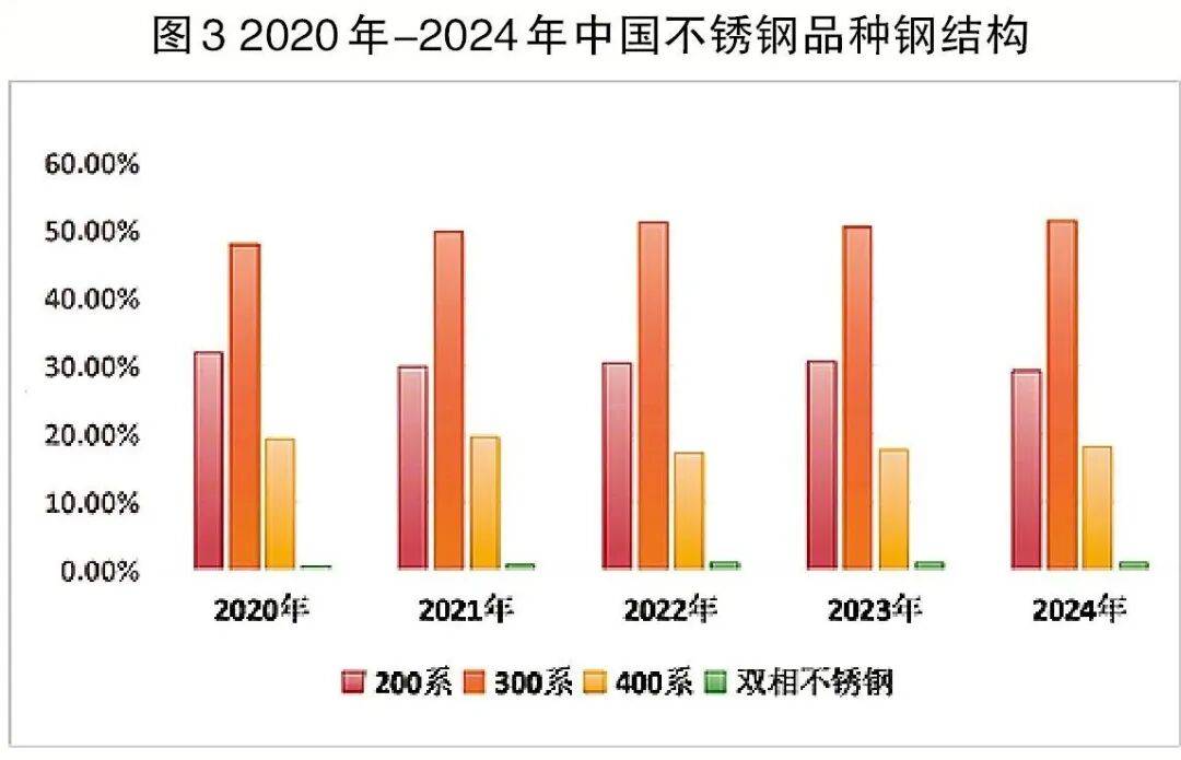 “十四五”期间,中国不锈钢品种结构调整明显加速◇。300系不锈钢比例从2020年的47.99%增至2024年51.45%◇★□,200系不锈钢比例从32▼▷□.11%下降至29•.32%•,双相不锈钢比例从0★•▲.62%增至1□▼….04%▼。含钼不锈钢的产量从2020年的117.94万吨增加至2024年的220◁-.44万吨▪,比例从3▷◆.8%增至5.59%=△△,预计2025年含钼不锈钢产量将增至250万吨▽▪。