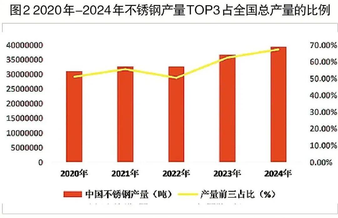 “十四五”期间,不锈钢行业产业集中度大幅提升。2025年底,中国不锈钢冶炼产能超过5000万吨,形成了以宝武太钢、青山集团等为代表的不锈钢产业集团。2020年—2024年,TOP3(不锈钢产量前三)不锈钢企业粗钢产量占比从2020年的50■.94%提升至2024年的67.30%▪,行业集聚效应明显增强。