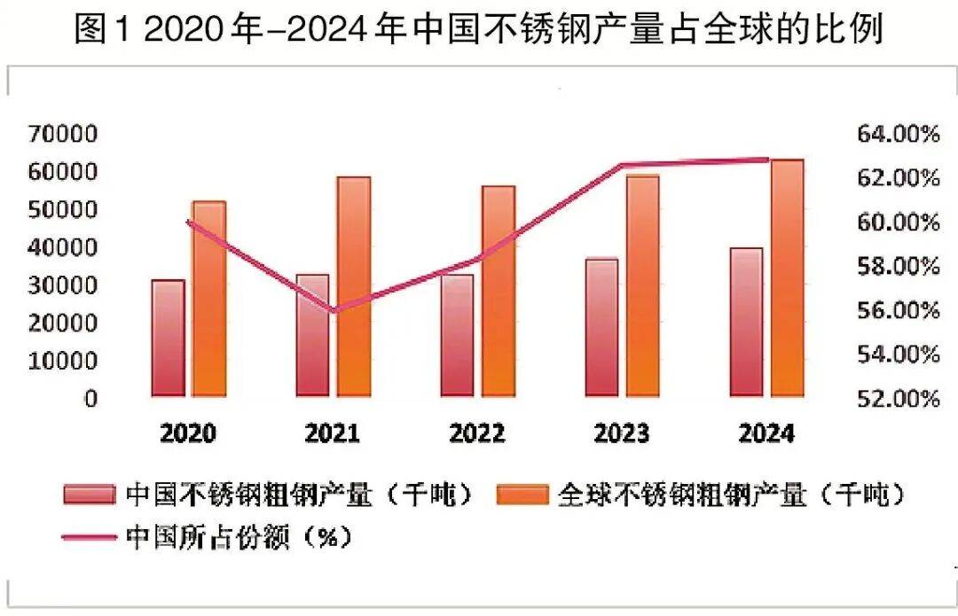 ▼▲“十四五”期间,中国不锈钢粗钢产量基本保持稳步增长态势●▲□。2020年,中国不锈钢产量为3103.9万吨▲,受新冠疫情影响,2022年中国不锈钢出口量大幅下降,粗钢产量略有降低☆□。2023年新冠疫情结束后,中国不锈钢粗钢产量实现12•.59%的高速增长=◆,达到3667.6万吨▽▽▷,中国占全球不锈钢产量的比例跃升至62.54%。预计2025年不锈钢粗钢产量达到4100万吨,在全球的占比将进一步提高。