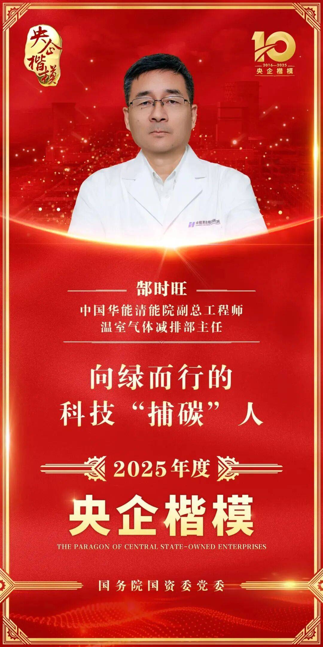 郜时旺,中国华能清洁能源技术研究院副总工程师,高效灵活煤电及碳捕集利用封存全国重点实验室副主任,全国优秀员、全国劳动模范,党的二十大代表。二十余载扎根科研一线,他带领团队让我国碳捕集技术从无到有、从追赶到引领,用“中国创造”为全球气候治理注入强劲动能。
